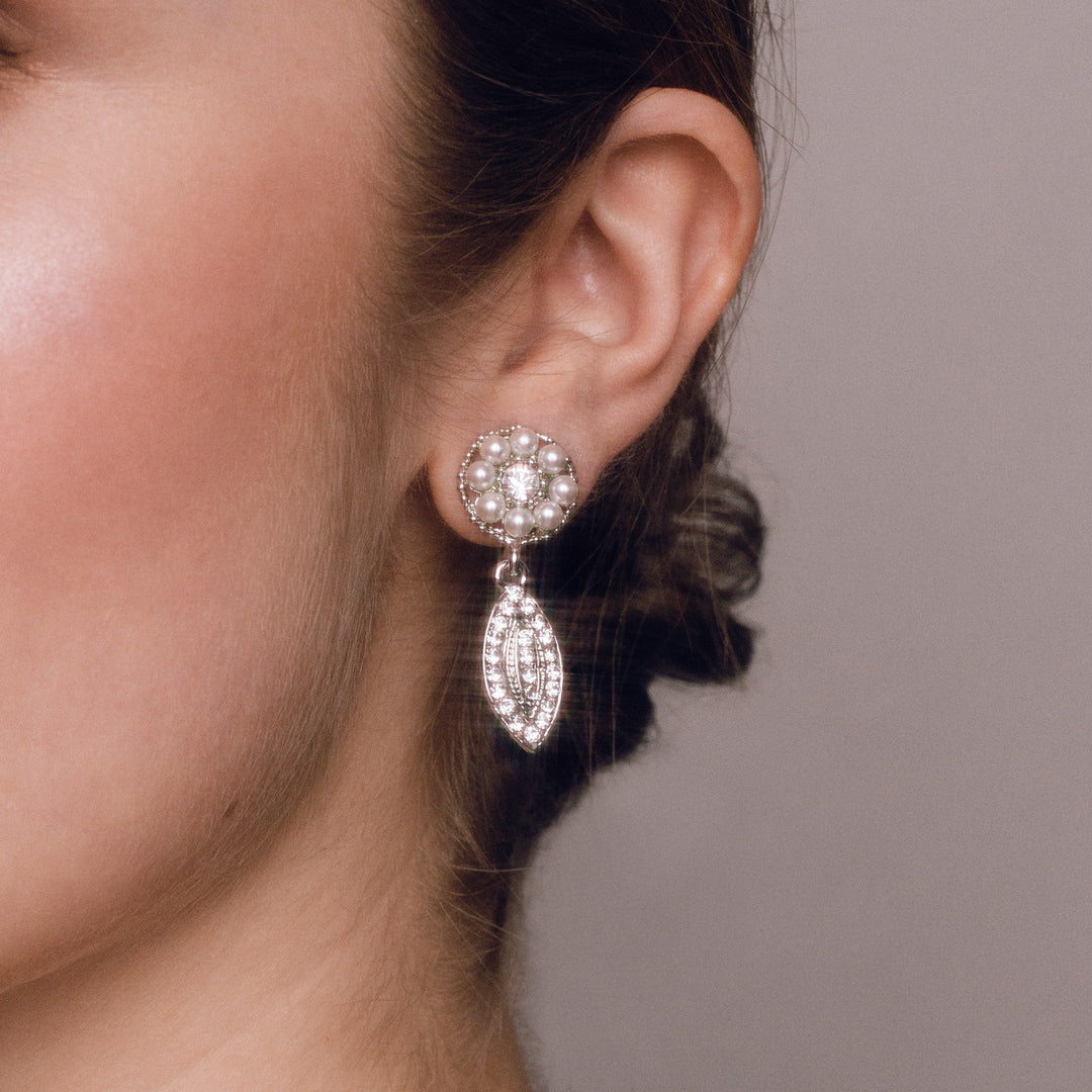 Feiner Ohrschmuck überzogen mit Perlen und Kristallen von Swarovski®, mit denen du deinem Outfit einen subtilen Hauch von Glamour hinzufügen kannst. An den mit Perlen besetzten blumenförmigen Clip, fügt sich ein funkelnder Blatt Anhänger.